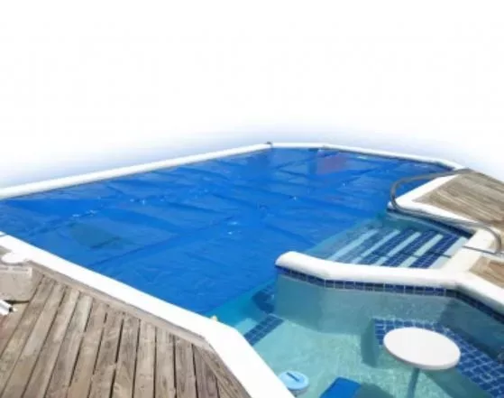 The two-layer UV-stabilized, 400-micron-thick, PE cover with an air bag facing the water and placed on the water surface protects the pool from cooling and transfers the heat of the sun's rays to the water to warm the pool.